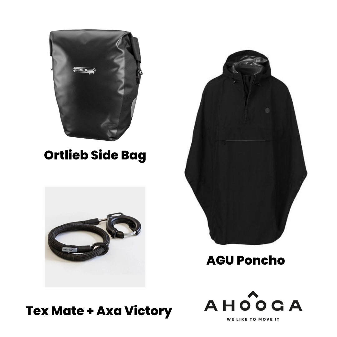 We thought about your heavy loads with a FREE Ortlieb side Bag, rain protection with an AGU Grant Poncho Black and an anti-theft solution with the TEX Mate lock Axa compatible together with the AXA lock.